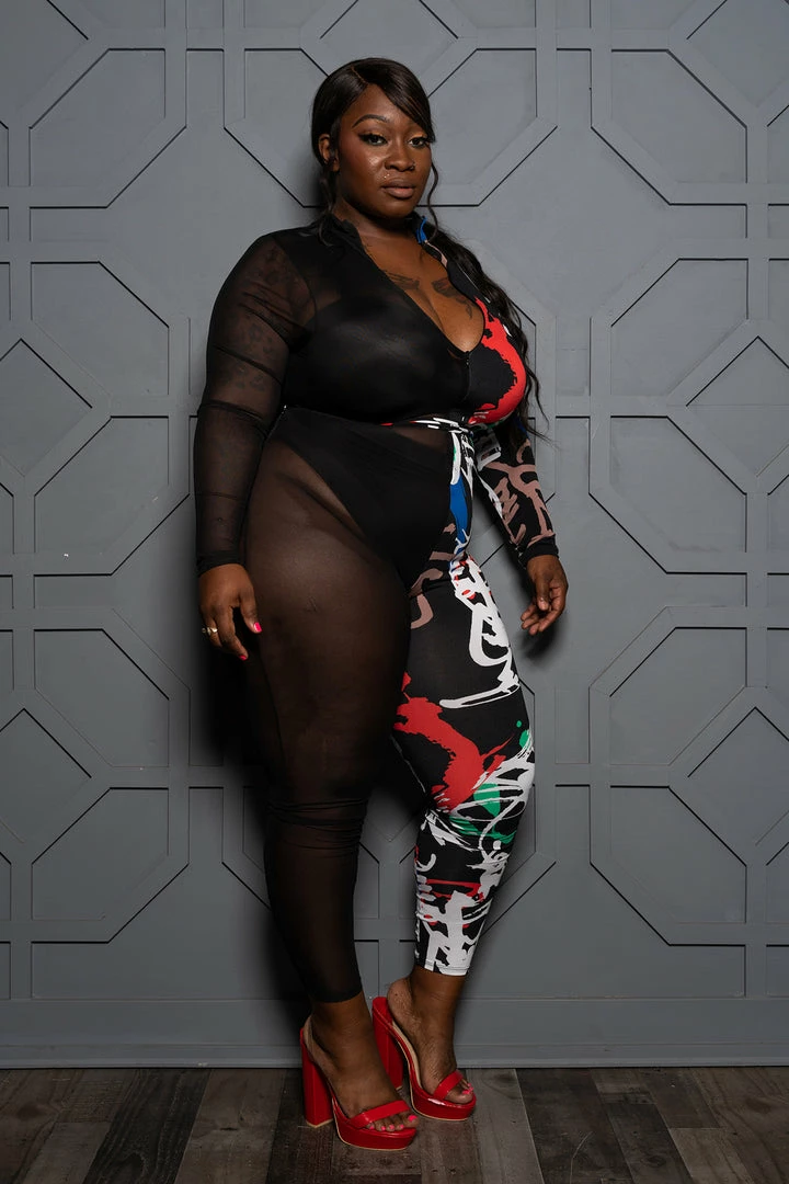 Boutique115 “Go Krazy” Psychedelic Print Mesh Jumpsuit – Black White