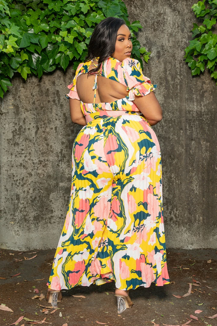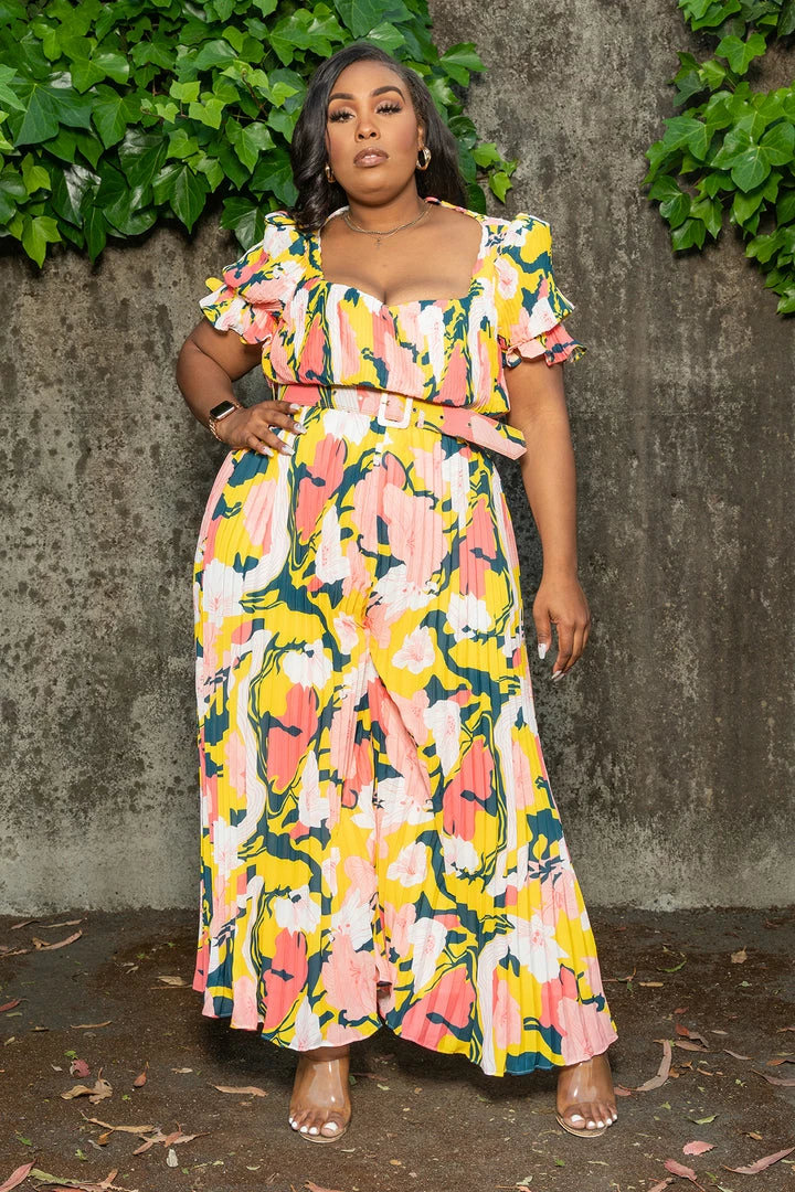 Our Luxe Collection just got a new addition. This luxurious high end jumpsuit hits for Spring 2022. Fully pleated, flared leg with an adjustable belt.Â